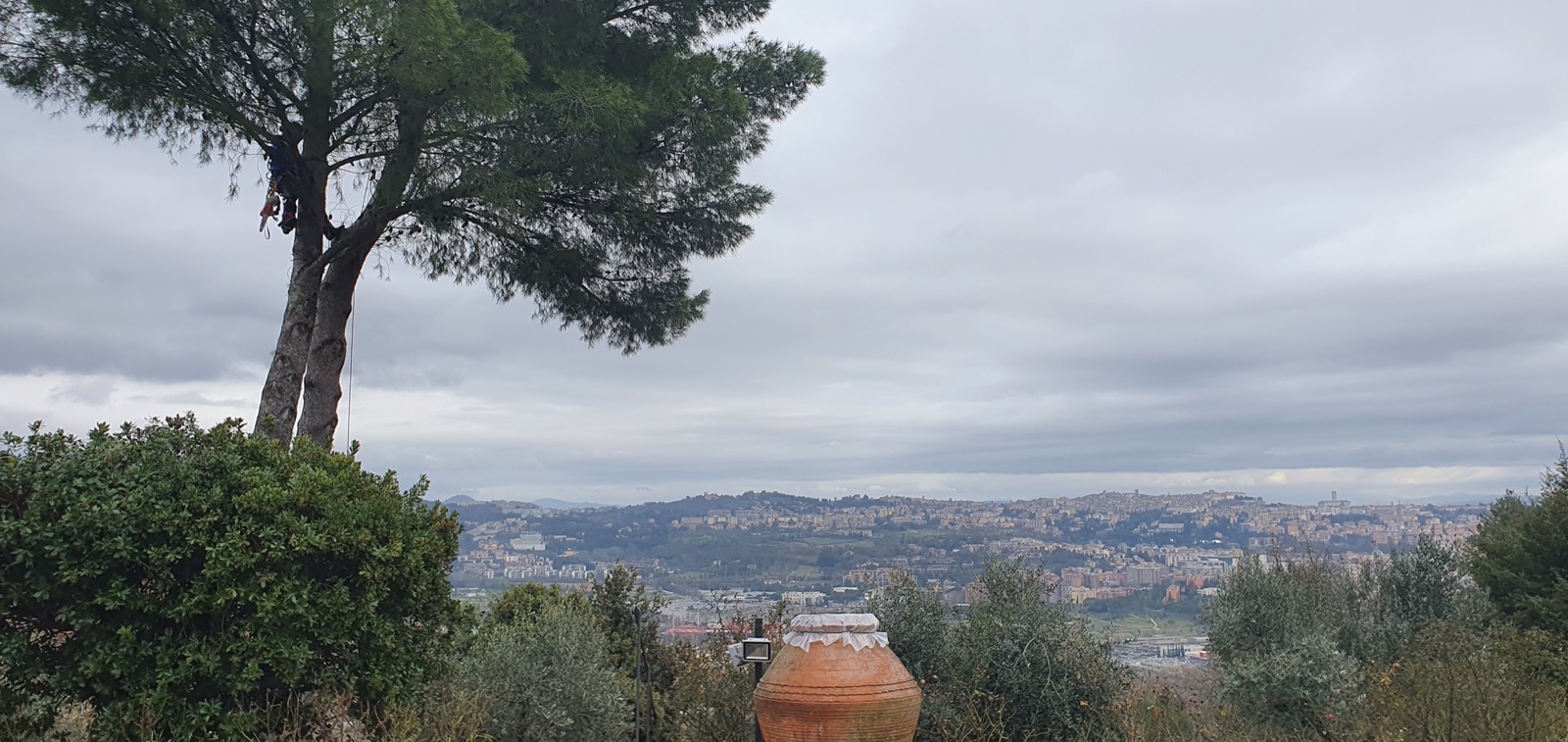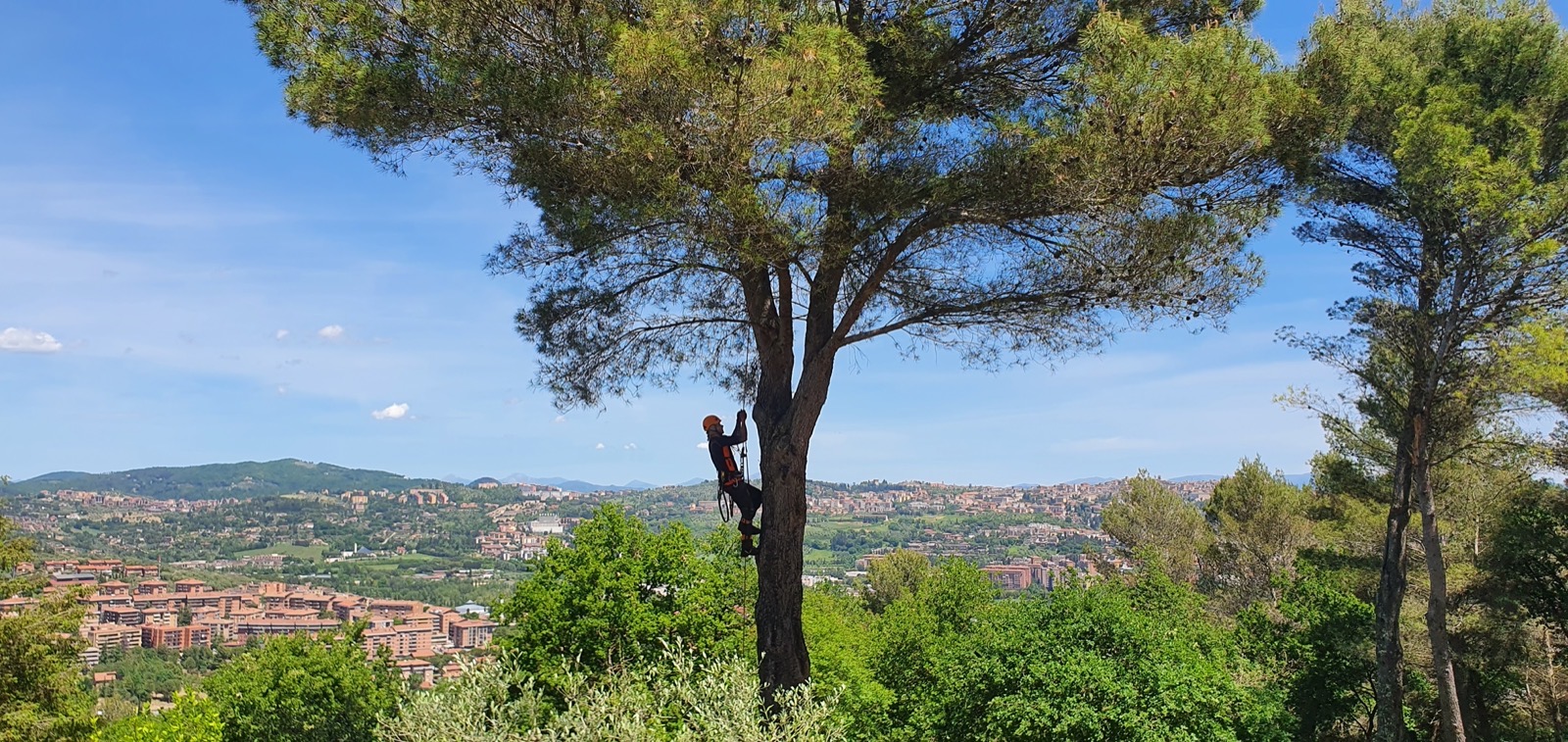 Maintenance pruning on a magnificent Lebanese cedar over 80 years old in the historic centre of Perugia. The tree had several dead branches in the upper crown and a general overloading of the main limbs that was compromising its stability. Using tree climbing techniques, we reached every part of the crown to remove deadwood, lighten the overburdened branches, and restore balance to the overall structure of the tree. The intervention required particular care to preserve the cedar's natural form, respecting its grandeur while ensuring the safety of the surrounding area, which is frequented daily by residents and visitors to the historic centre.
