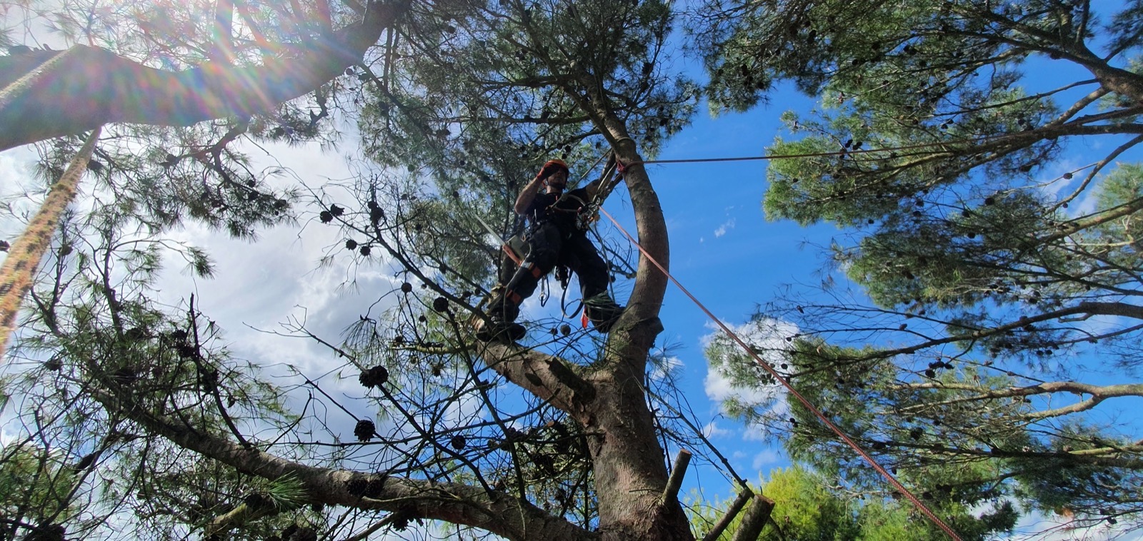 Controlled felling of a 25-metre poplar located between two houses in Corciano. The tree showed clear signs of internal decay at the base of the trunk and a dangerous lean towards one of the adjacent properties. Given the extremely confined location, with less than three metres between the buildings, we chose a progressive top-down dismantling approach. Every section of the trunk and branches was carefully rigged and lowered to the ground using a system of ropes and pulleys, preventing any damage to the surrounding structures, gardens, and power lines in the area. The entire operation concluded with stump grinding and a thorough site cleanup.